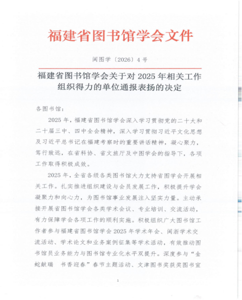 近日,福建省图书馆学会发布《福建省图书馆学会关于对2025年相关工作组织得力的单位通报表扬的决定》,对在2025年相关工作中组织得力的单...