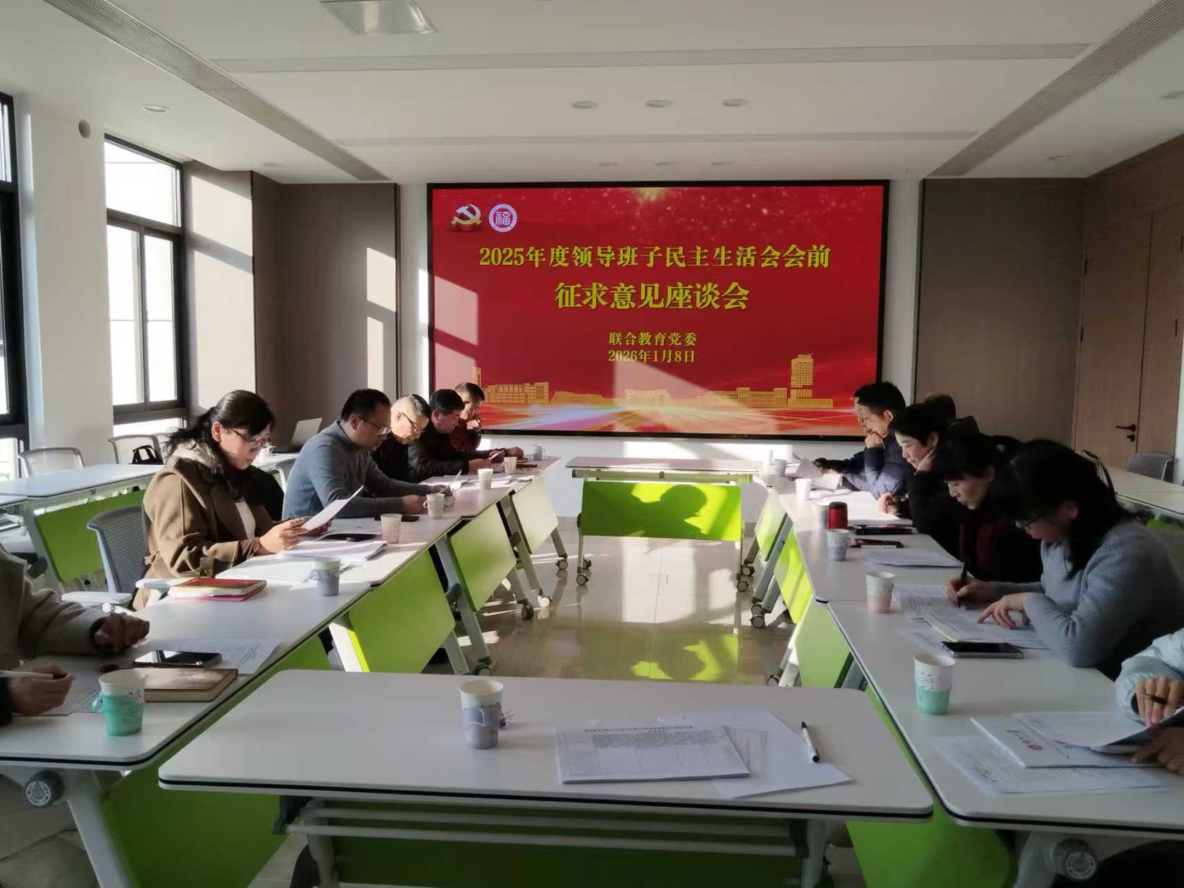 2026年1月8日下午,联合教育党委在科技园12号楼402会议室举行了基层党支部书记抓基层党建工作述职测评暨领导班子民主生活会会前学习与征求意见座谈会。联合教育全体两委委员以及党支部书记参加会议,党委常凯书记主持会议并讲话。